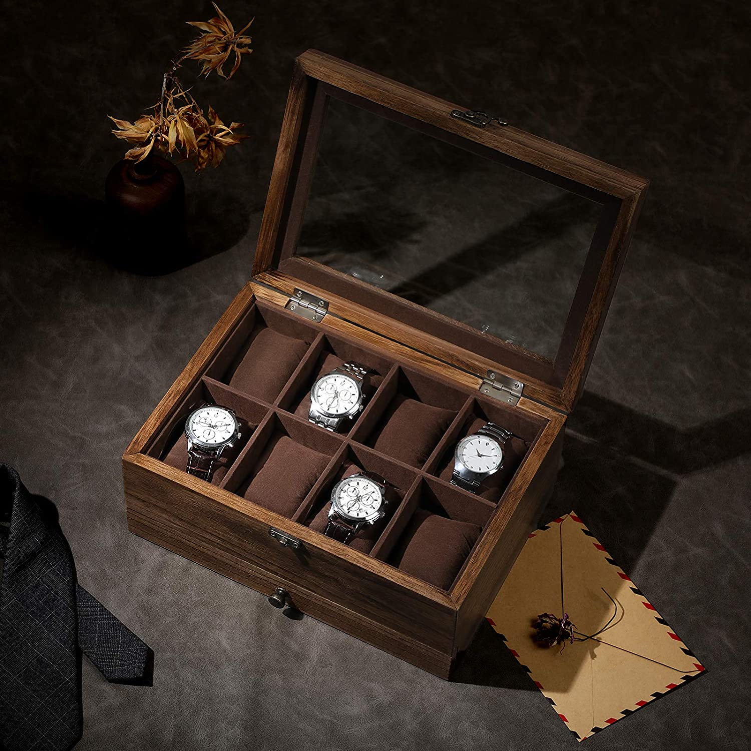 - GIVE YOURSELF A RUSTIC CHARM: Your tasteful watches deserve a tasteful home. Reflecting the charm of rustic wood, this watch box lends a unique beauty, without stealing the show from your valuables