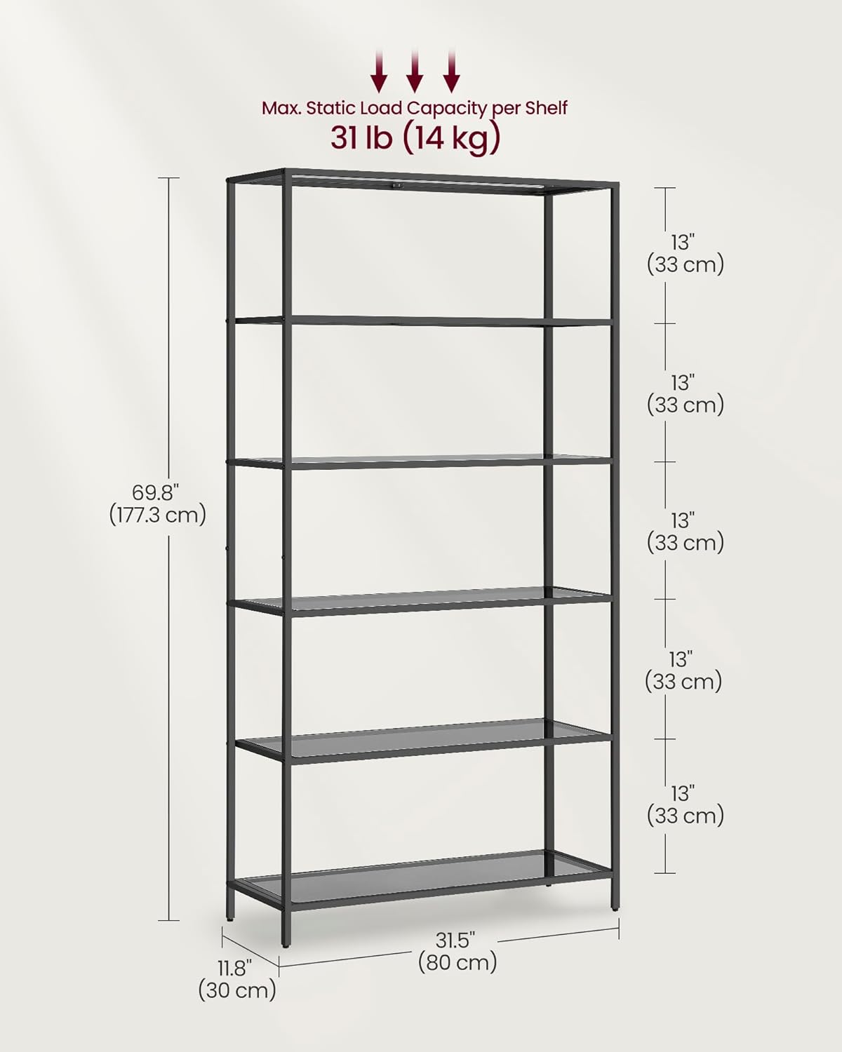 - [6 tiers to make the most of space] This glass shelf takes up very little floor space, just 30 x 80 cm; with 6 levels and a height of 177.3 cm it can help you maximize vertical space