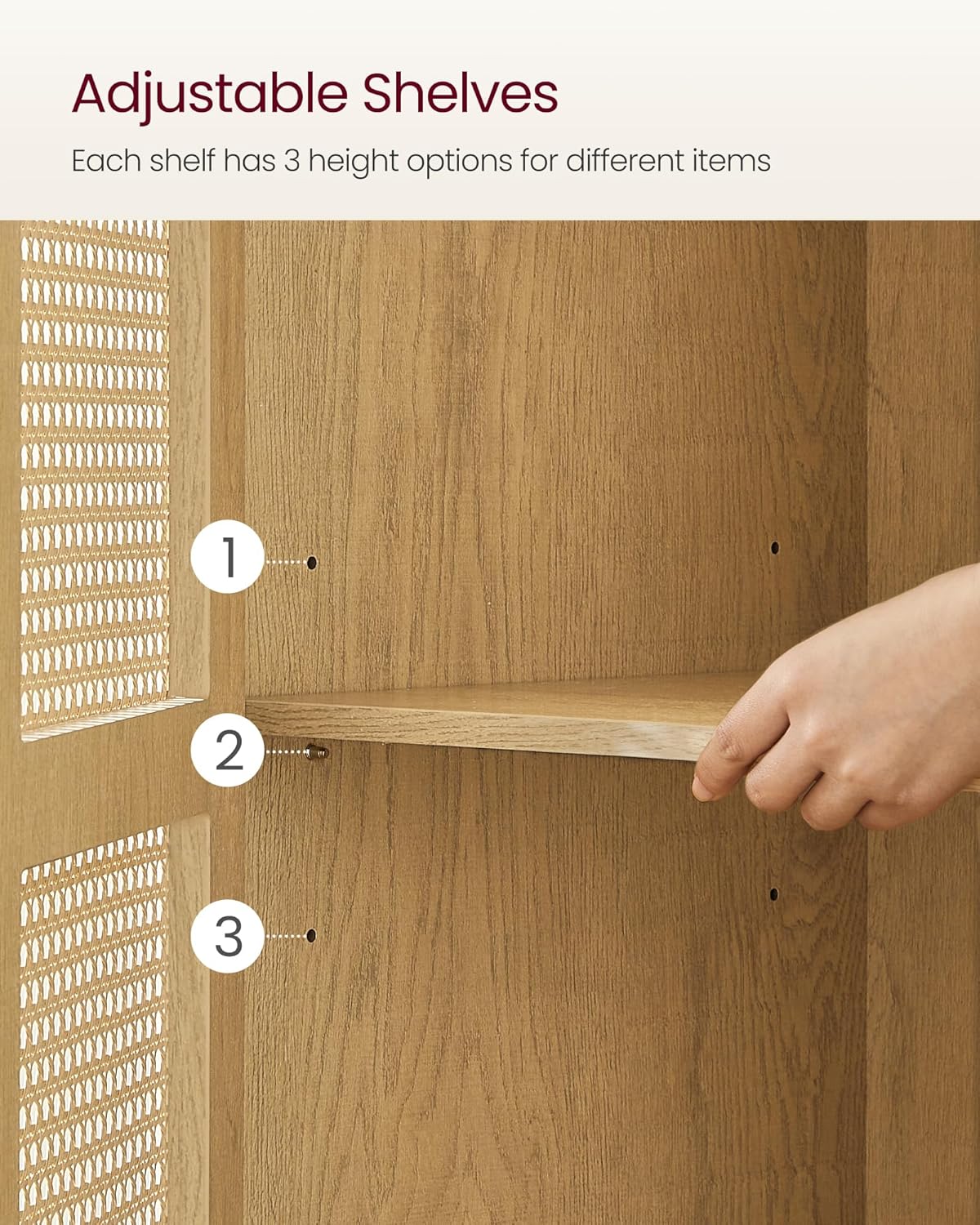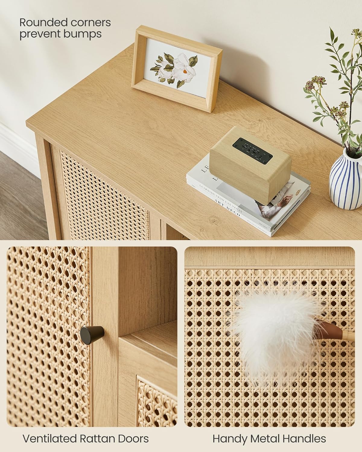 【INFUSE BOHO CHARM】Featuring a natural finish, synthetic rattan doors, and black knobs, this storage cabinet brings a trendy boho vibe to your space