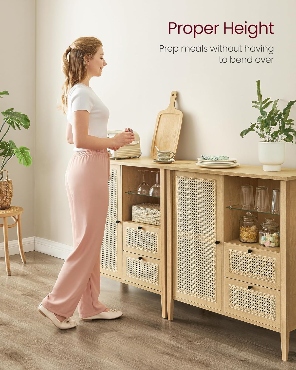【DURABLE AND STURDY】Constructed with MDF legs, particleboard panels, a glass shelf, and synthetic rattan doors, this buffet cabinet is built to last and provide strong support