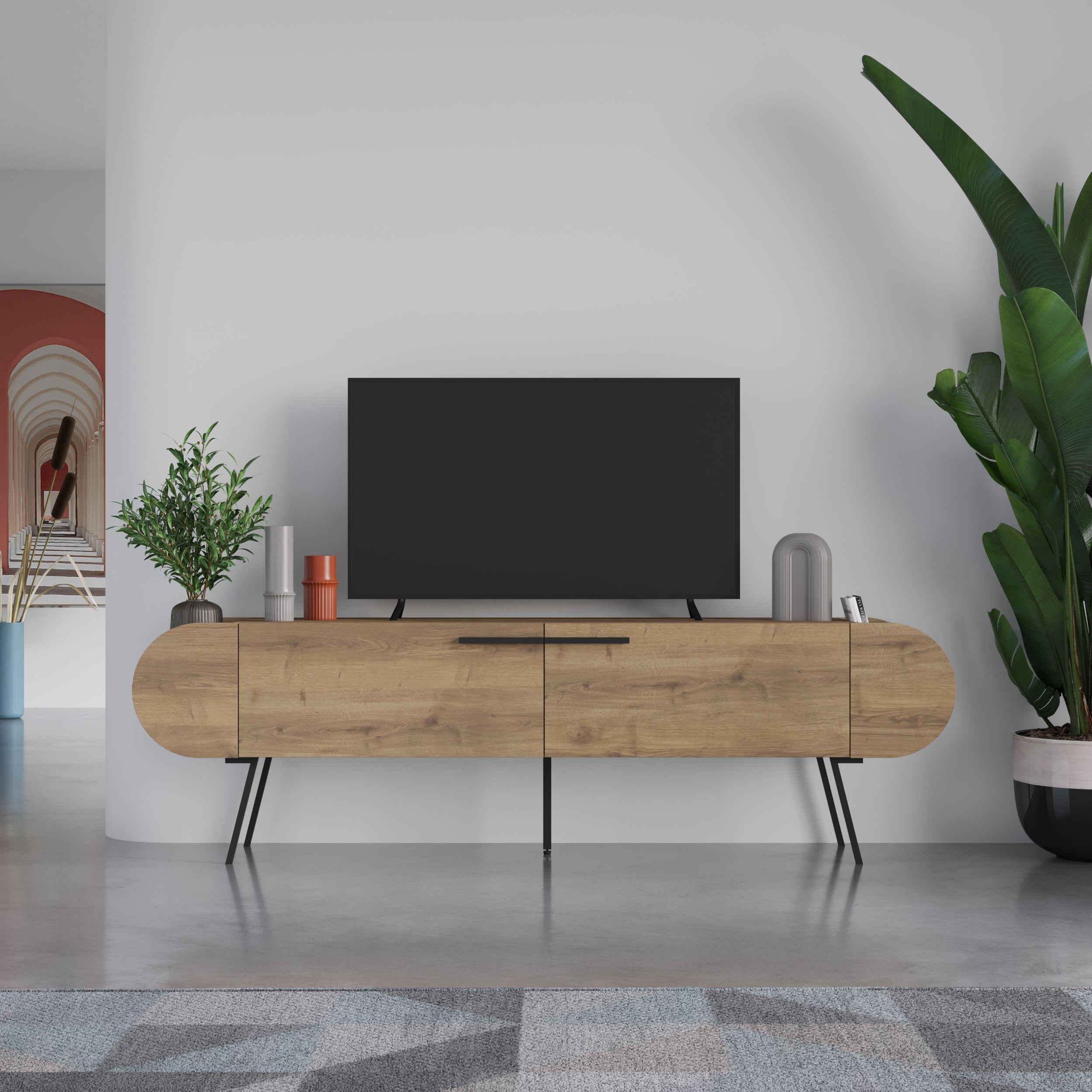 - This TV unit's design seamlessly marries aesthetics with utility, offering a spacious top surface for your television and additional display options. Elevate your entertainment area with our Brown Wood TV Unit with Two Doors – where style meets organization for a harmonious living space.