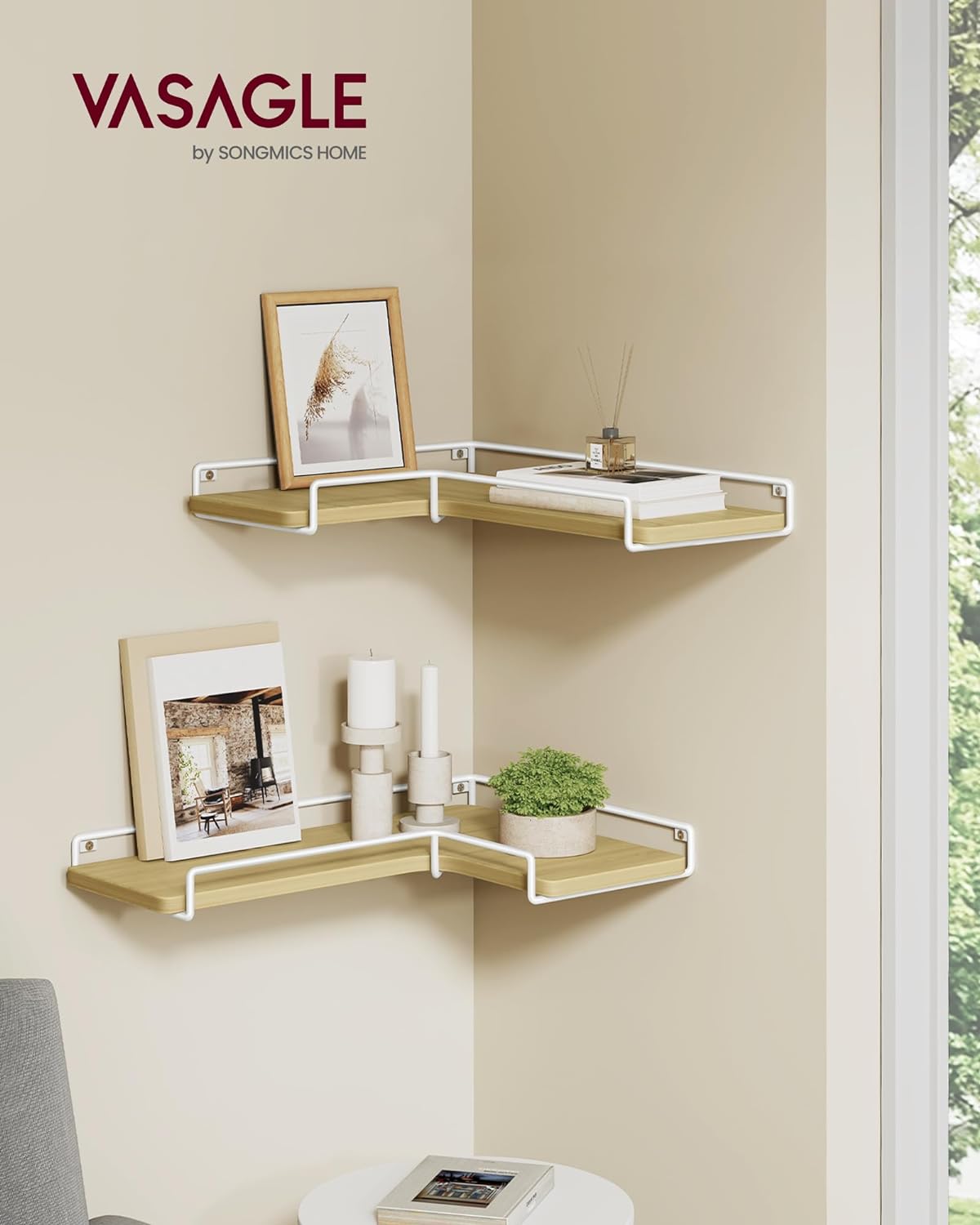 [Versatile] This corner shelf set combines storage and display in one. Use it in the living room for decorations, in the bedroom to store photo frames, or in the kitchen to organise bottles and jars—the possibilities are endless