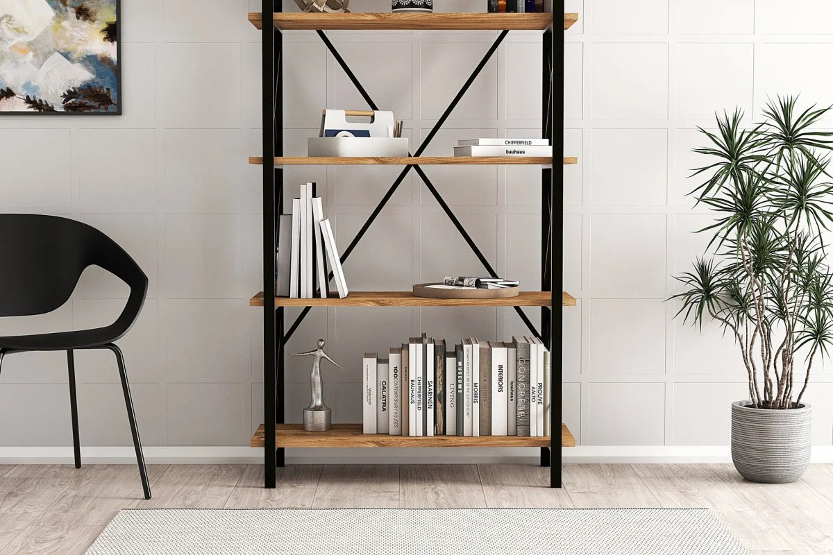 Maximized storage with a modern edge. This tall, wide shelving unit is designed to anchor your room with a bold industrial presence. Combining thick wood-textured shelves with a robust black metal frame, it offers expansive space for everything from heavy hardback books to oversized decorative accents.
