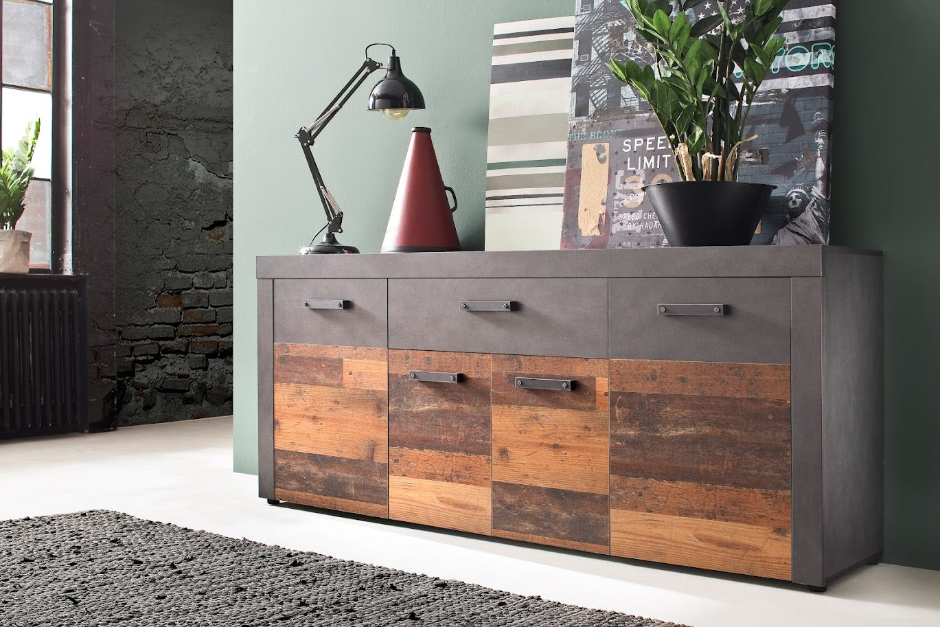 Add bold industrial flair to your home with the Indy Industrial Sideboard, a standout piece combining raw textures and smart organization. Featuring a dark concrete-look frame and striking reclaimed wood-style front panels, this wide sideboard is a statement in both form and function.