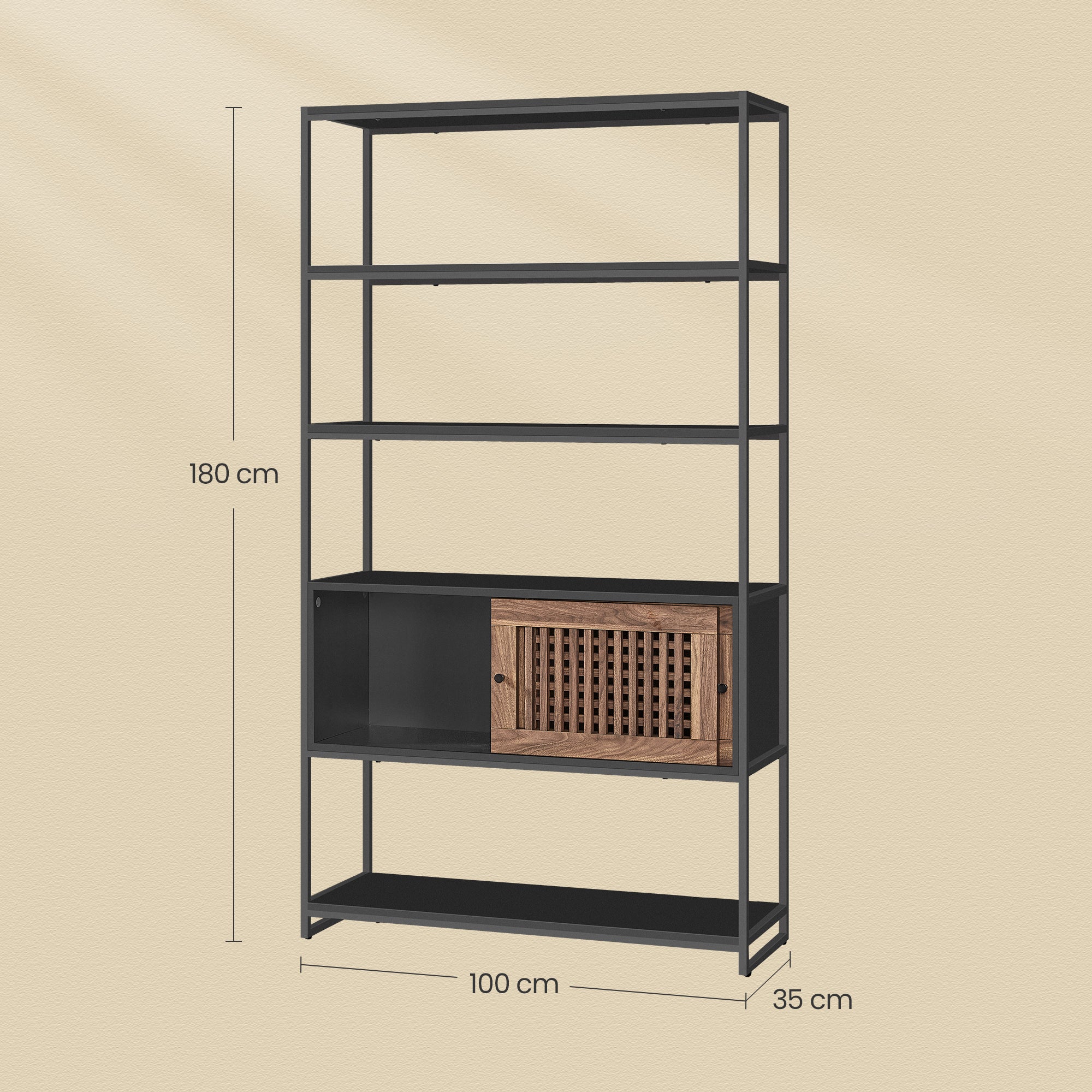 Measuring 180x100x35 cm, the shelf offers plenty of vertical storage space, saving valuable floor space. It has an adjustable cabinet that can be placed on the bottom level or second from the bottom, allowing you to adjust the shelf to your organizational needs.