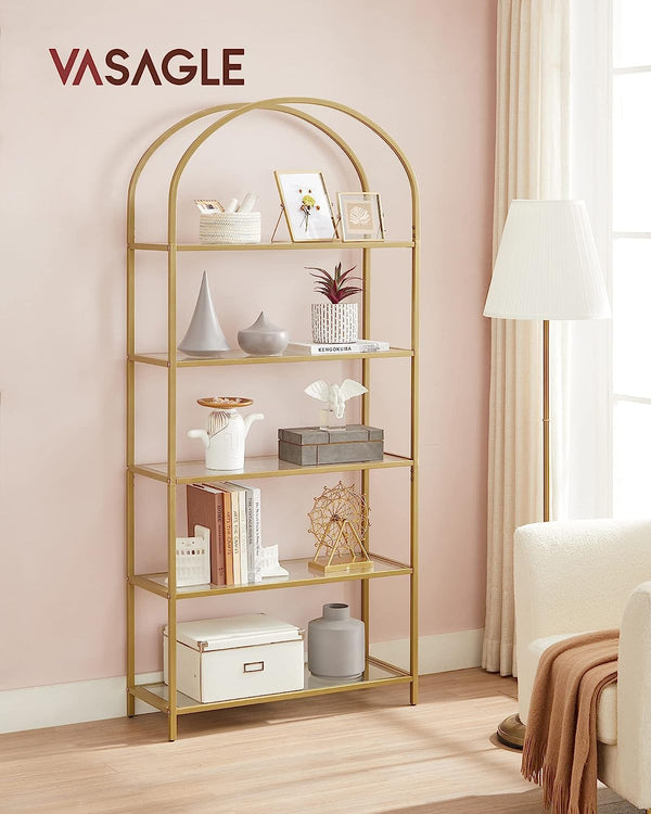 - A Dignified Stage, Your precious collections deserve a storage shelf worthy of yours. Just like this shelf, which highlights everything you value with its chic arches and glass shelves with gold steel frame