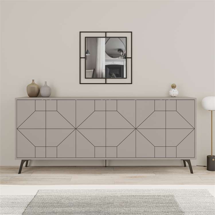 Bring modern elegance into your home with this sleek taupe sideboard featuring bold geometric patterns across its front panels.
