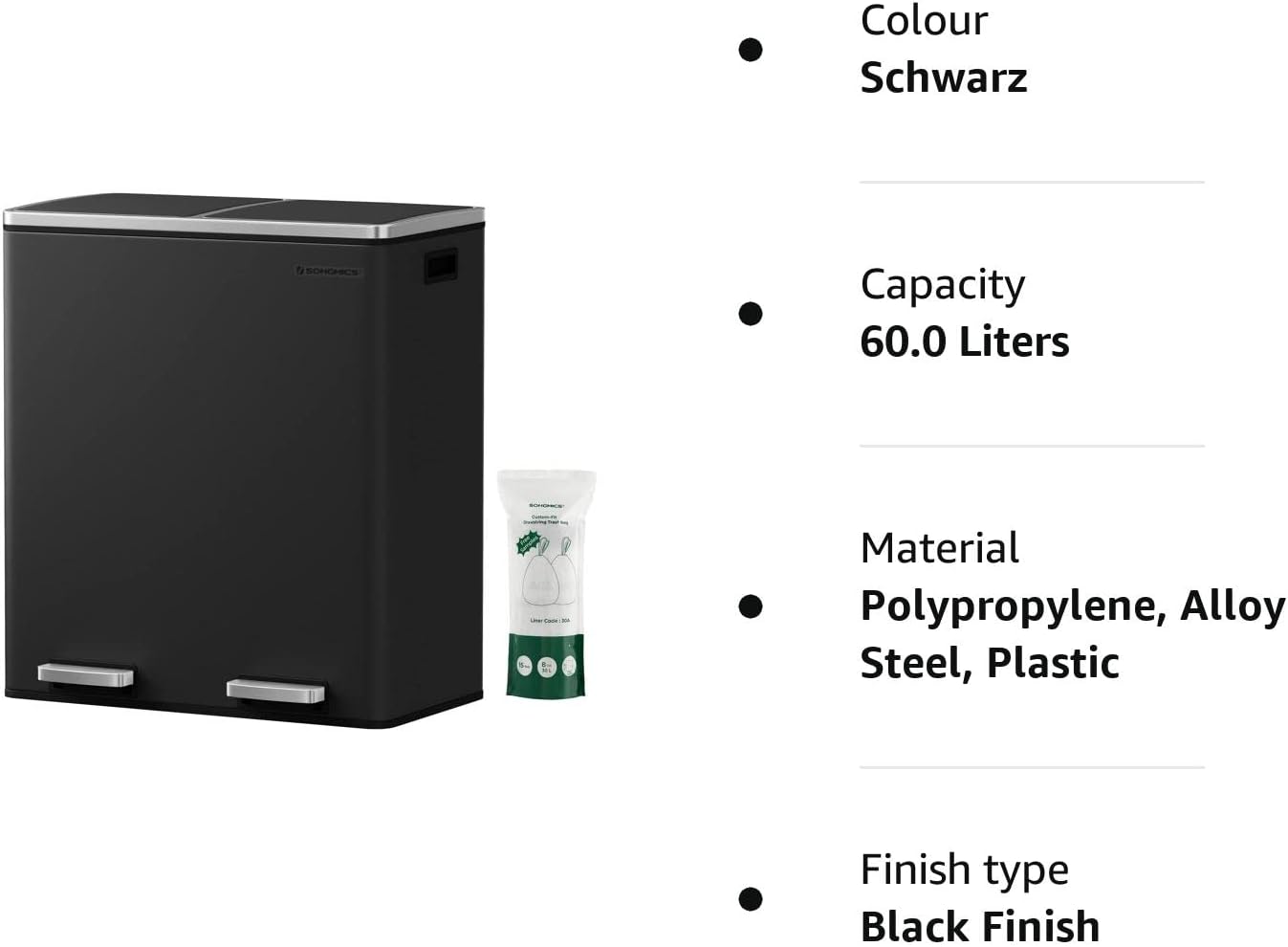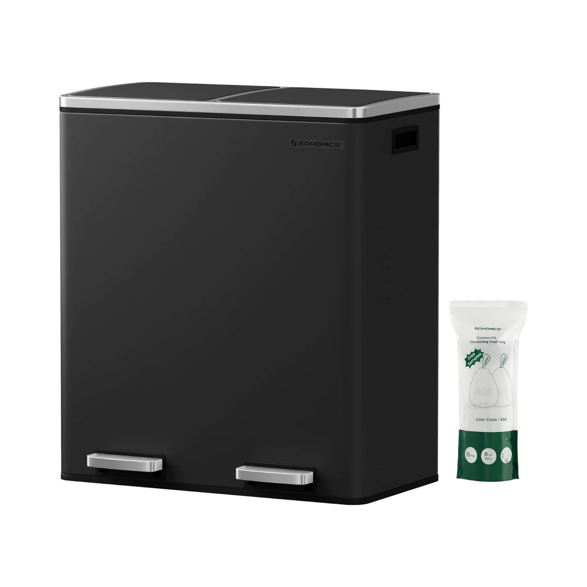 [What You Get] A rubbish bin sized at 59 x 32.5 x 65.2 cm with 2 x 30L compartments, 15 plastic bags, plastic inner buckets, and a soft closure mechanism for easy waste disposal
