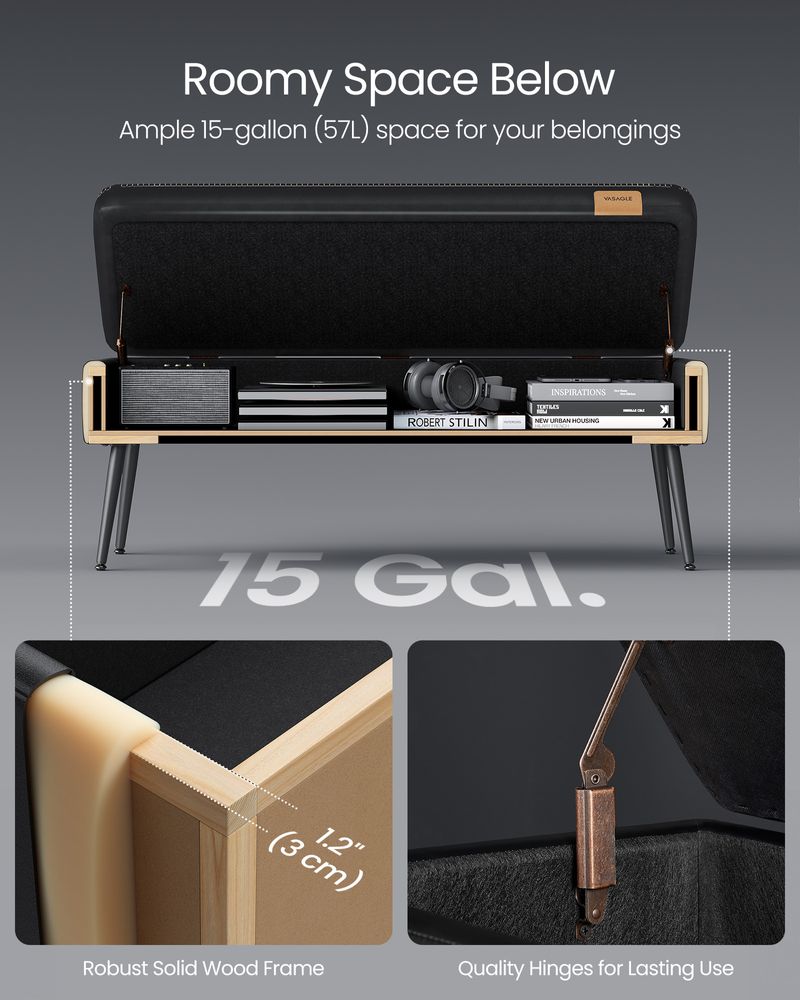 - [Spacious with Safety Hinges] With a 15 gal. (57L) capacity, our ottoman bench neatly stows everything from your blankets and pillows to clothes. The dual safety hinges on the lid promise smooth, safe operation and efficient access to your items