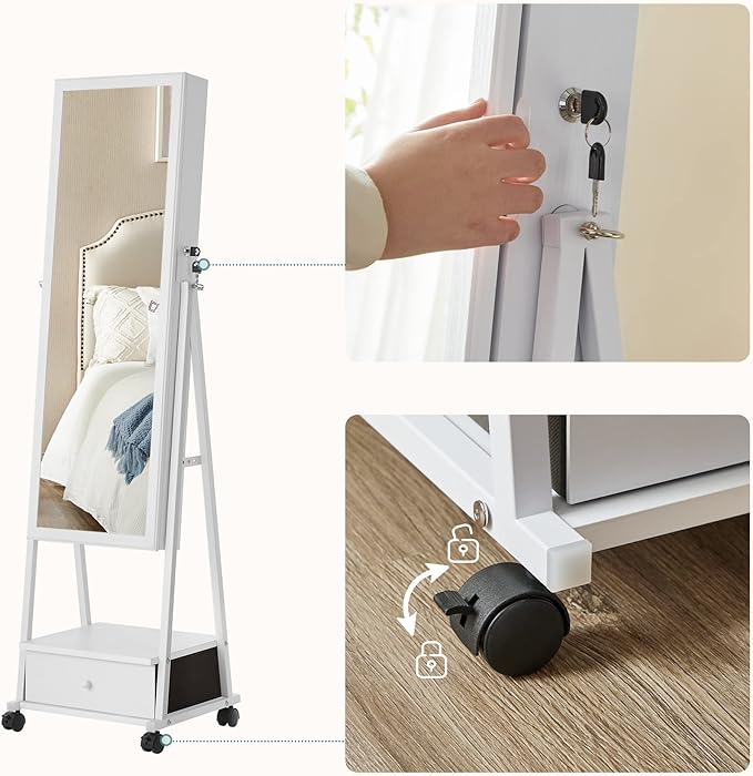 - FROM ROOM TO ROOM: Fill it, move it, lock it in place, check out your outfit with the large, full-length mirror. You can easily glide this jewellery cabinet with 4 wheels from one room to another and lock it in place as you get ready for a night out