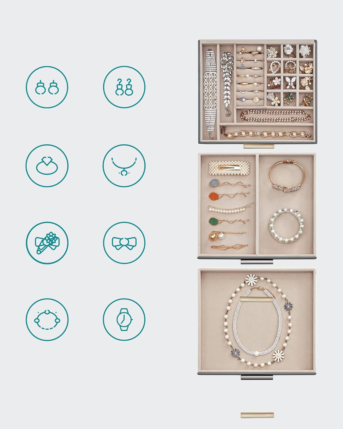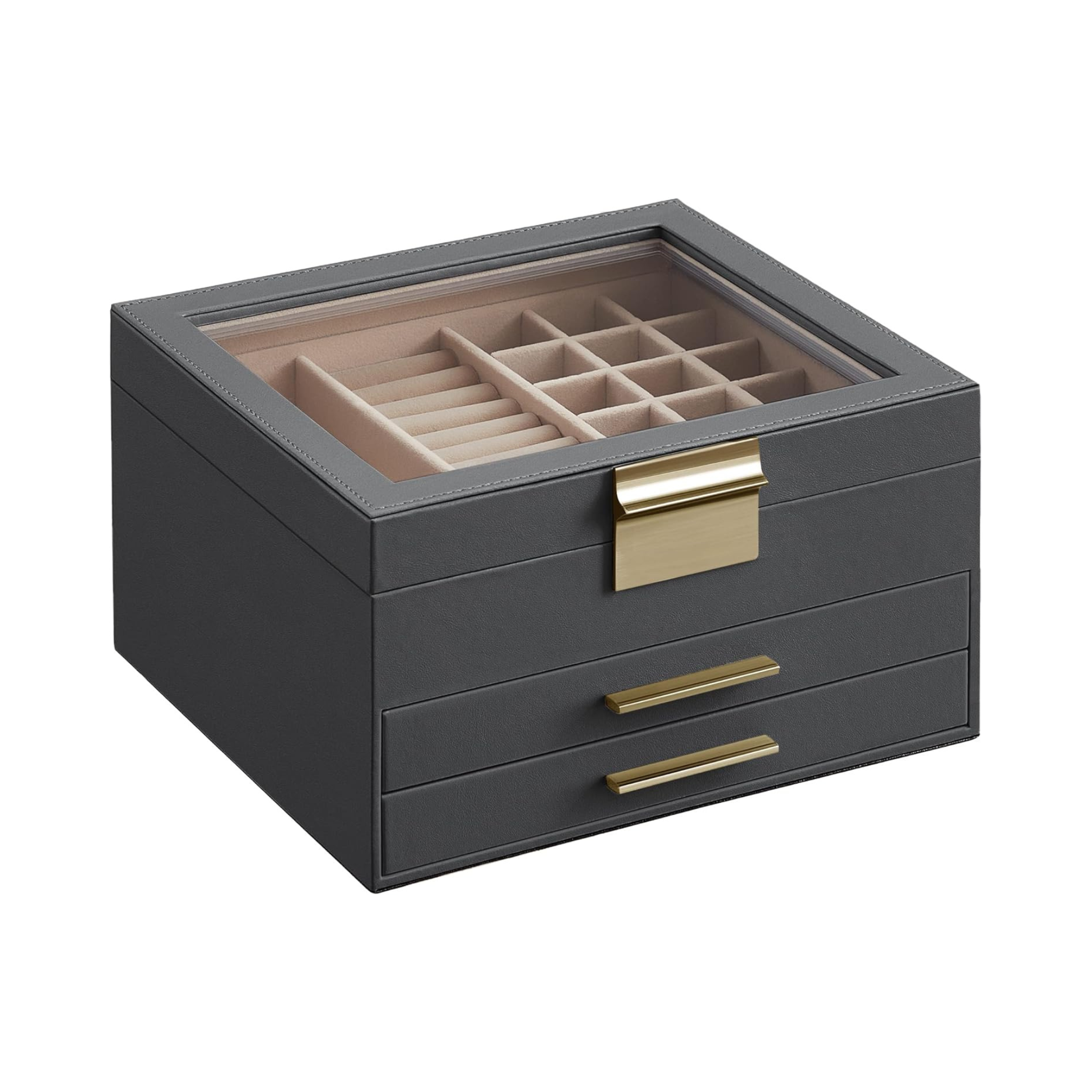- [Chic & Durable] With interstellar grey surface, gold metal handles, soft velvet lining, neat stitching, high-quality PU coating and sturdy MDF panels, this jewelry box is chic and durable