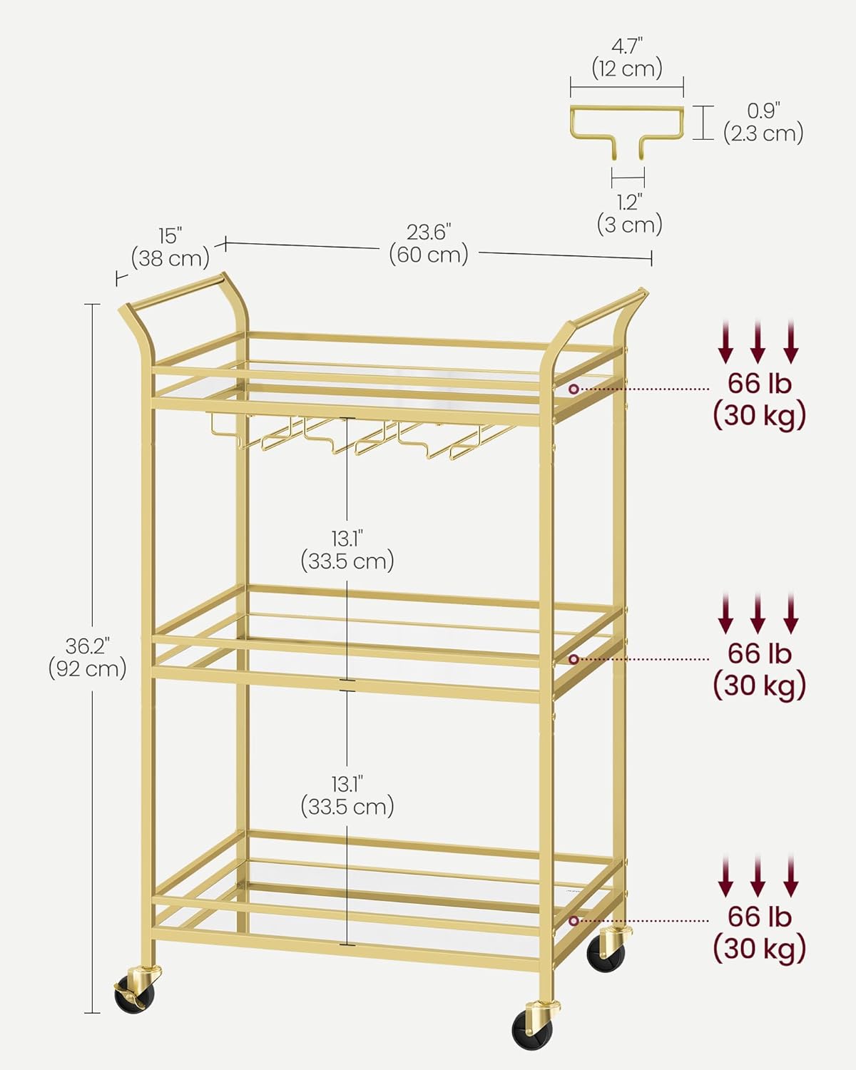 - [3 Removable Wine Glass Racks] This trolley comes with 3 wine glass racks, keeping your wine glasses within easy reach. Additionally, any of them are removable to cater to your preferences