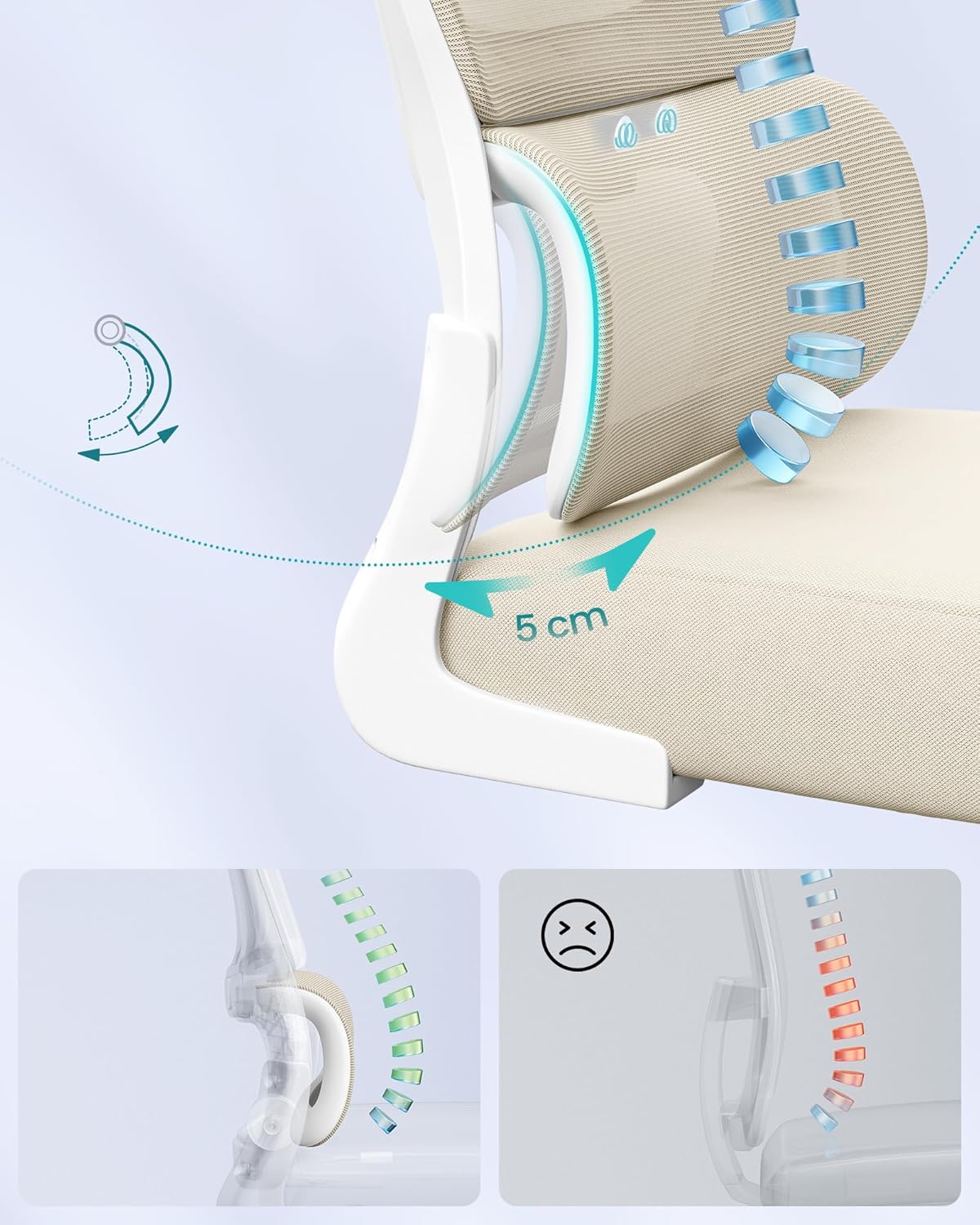 - Ergonomic Lumbar Support: This ergonomic office chair's curved, dynamic lumbar support actively adapts to your movements and cradles your spine's natural curve for added comfort