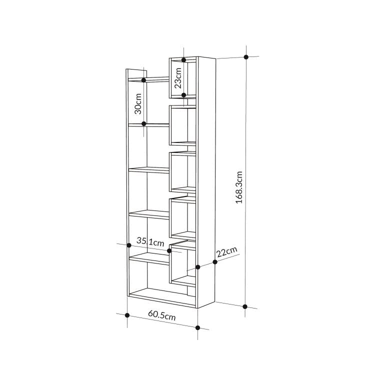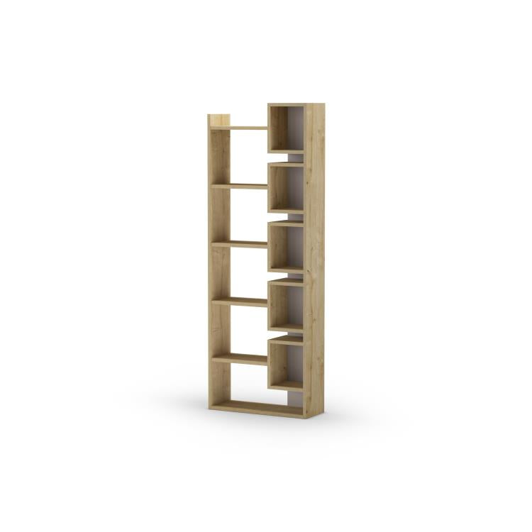 Showcase your books and décor with this stylish tall bookcase in oak and grey finish. Featuring an eye-catching asymmetrical design, it combines open shelves with boxed sections for both display and storage. The slim profile makes it perfect for living rooms, offices, or hallways, while the sturdy construction ensures long-lasting use.