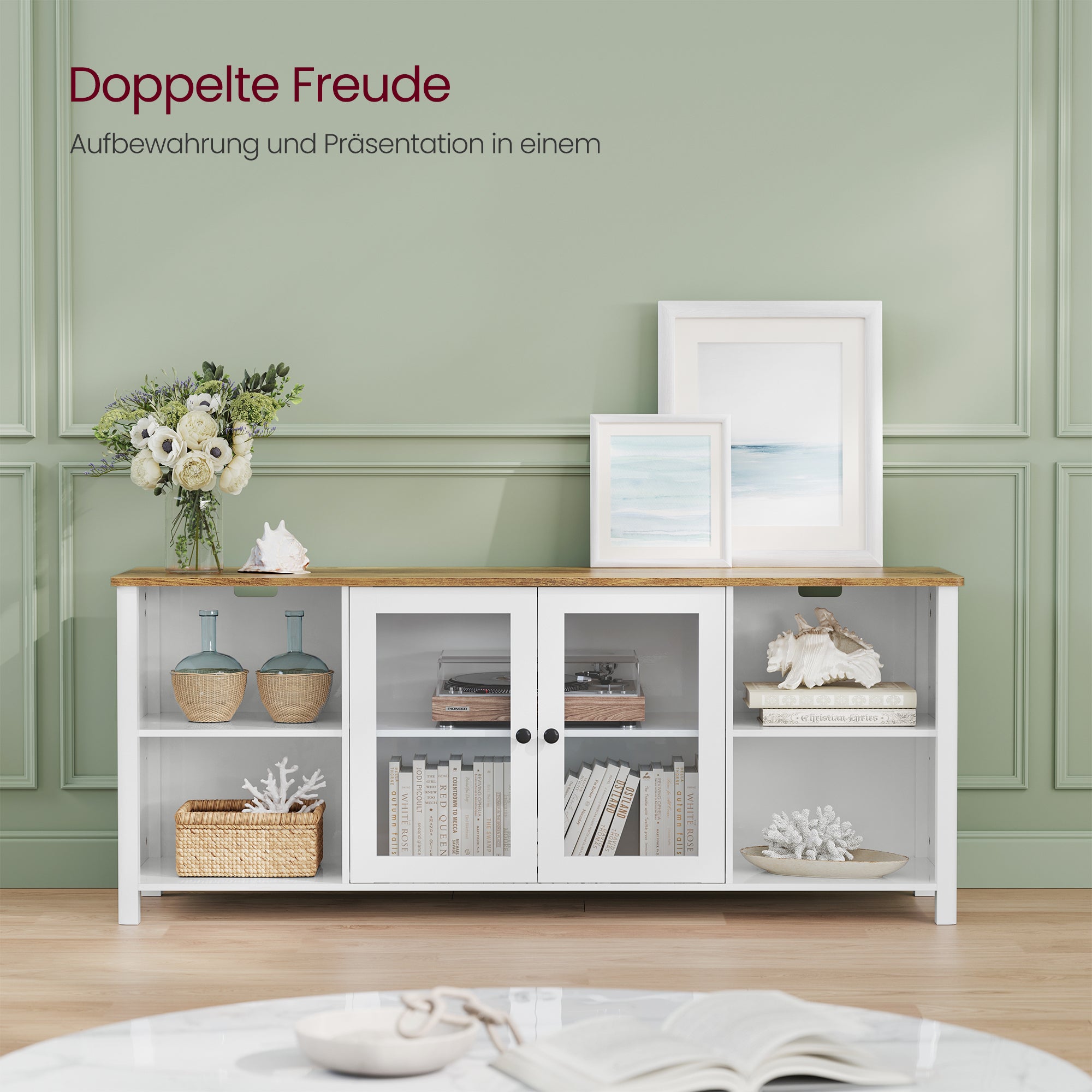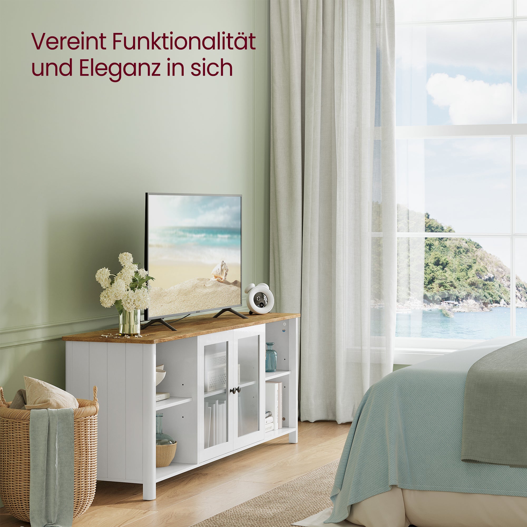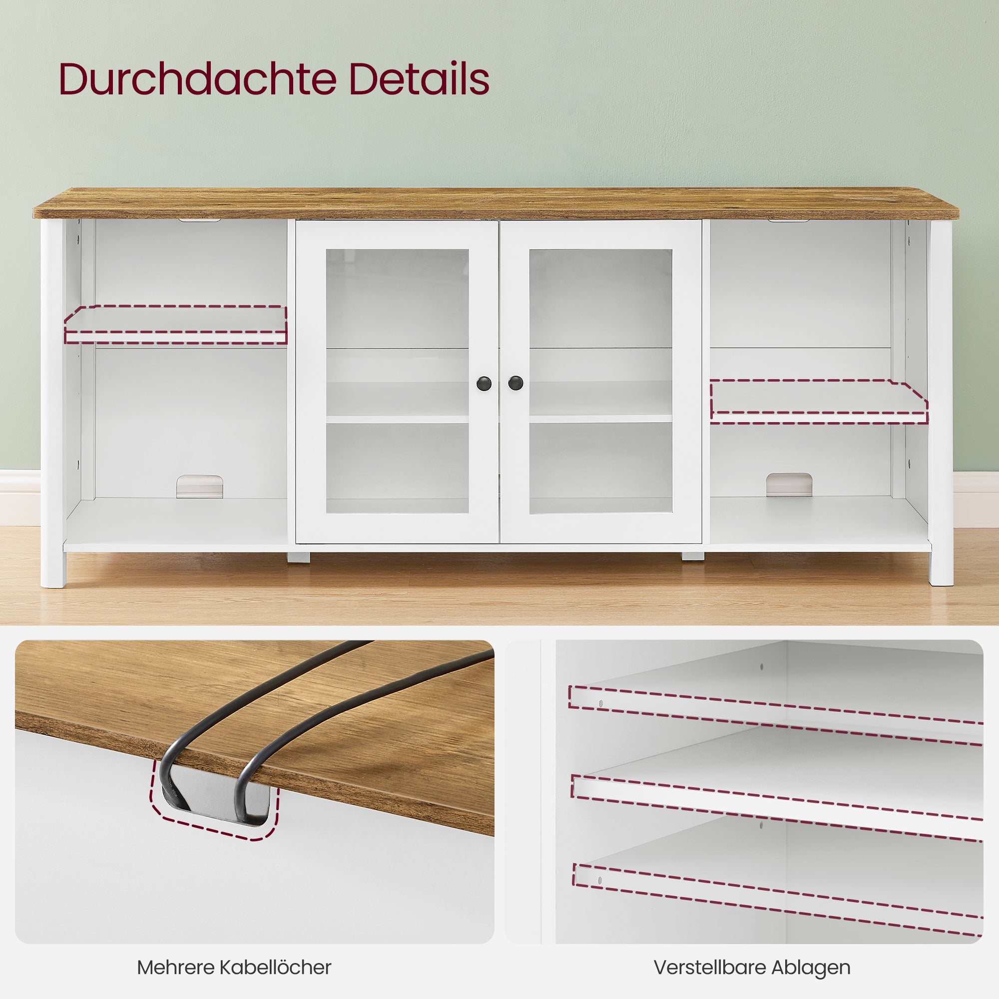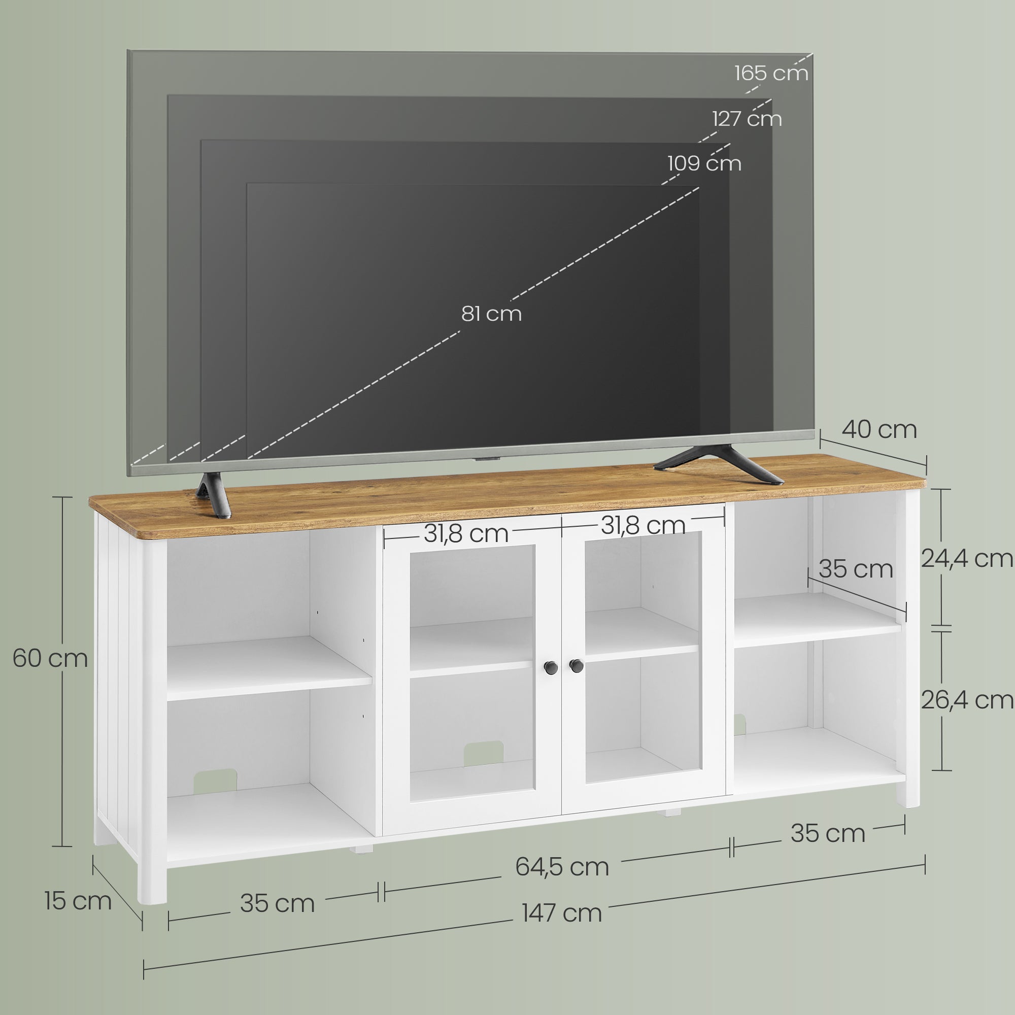 Bring warmth and charm to your living room with this VASAGLE Farmhouse TV Stand, designed in a beautiful two-tone style: a rustic wood-look top paired with a clean white frame. With a generous width of 147 cm, it is perfectly suited for TVs up to 65 inches and offers ample storage for everything you need.