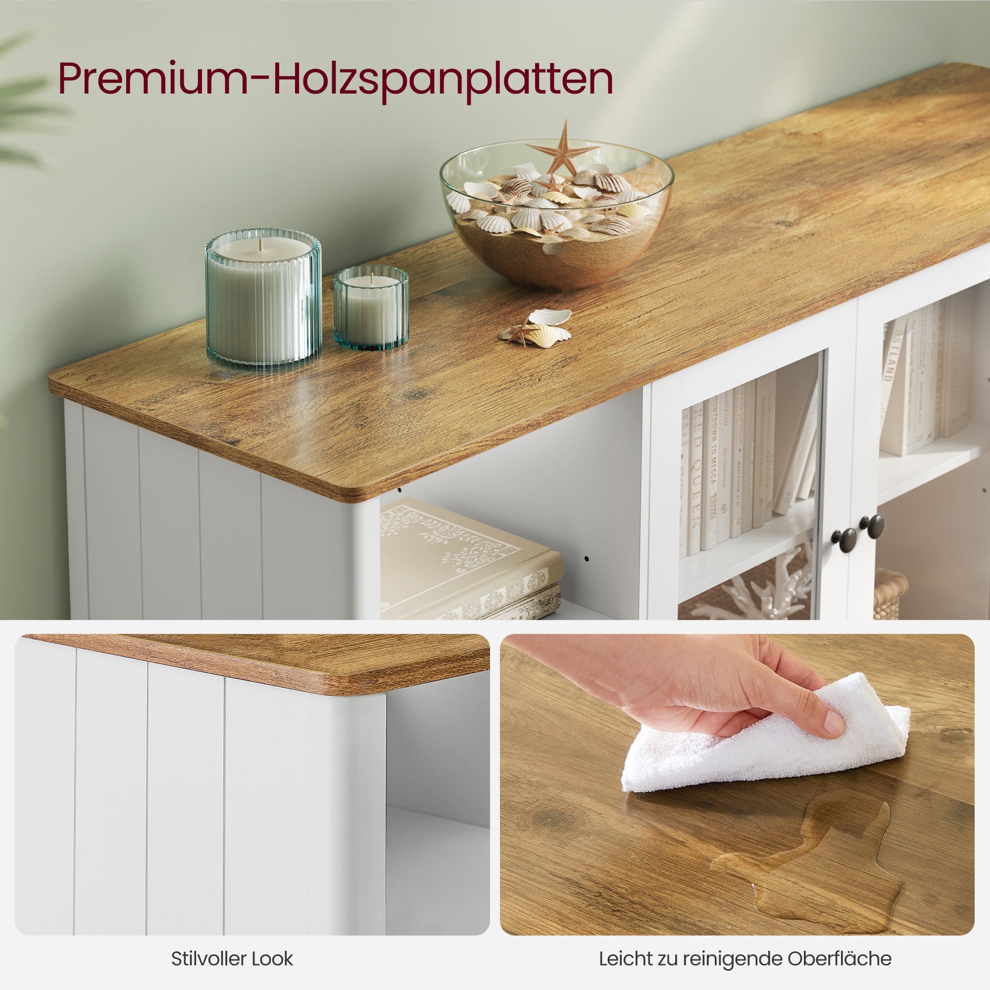 This media console combines cozy country style with practical functionality. The natural wood-look top provides a beautiful display surface, while the white frame and glass-panelled doors add both elegance and visibility to your storage.